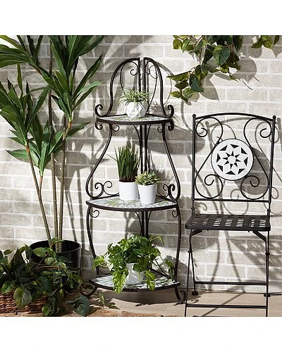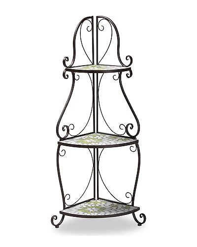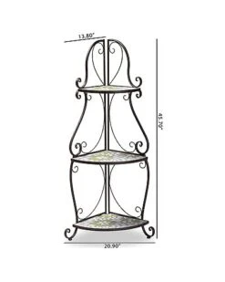 - Build the garden oasis of your dreams with the candid elegance of the Airell plant stand. this stunning piece is comprised of a sturdy metal frame adorned with colored glass accents. The three tiers of shelves form a lovely display for cherished plants and outdoor decorations. The Airell will arrive fully assembled and its frame is embellished with curled accents, lending a graceful presentation for your passion. Solving the needs of your garden in dignified style, the Airell plant stand is sure to become a beloved addition of any enthusiast. Overall Dimensions: 45.70in High x 20.90in Wide x 13.80in Deep