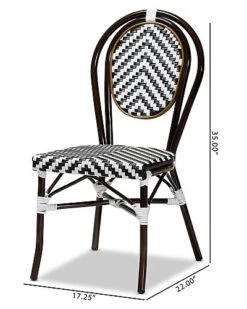 - Bring the charm of the classic French bistro to your home with the Alaire dining chair. this chair is constructed from aluminum with a high backrest that provides ergonomic support and comfort. This stackable dining chair is designed for everyday use and is superbly suited for a deck, balcony or indoor space. The Alaire will arrive fully assembled and features angled legs connected by a crisscross base for excellent stability and support. A stunning addition that complements a wide range of room layouts and styles, the Alaire dining chair brings ornate personality to the modern home. Overall Dimensions: 35.00″ High x 17.25″ Wide x 22.00″ Deep; Seating Area Dimensions: 16.00″ Wide x 16.25″ Deep x 17.00″ High; Legs: 15.00″ High; Back: 18.00″ High;