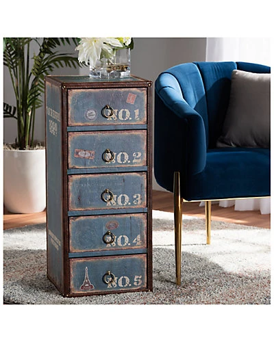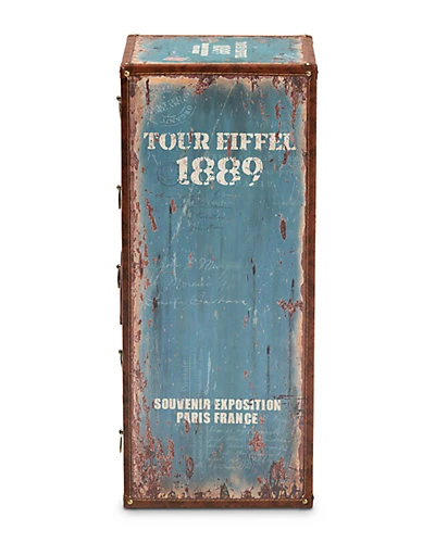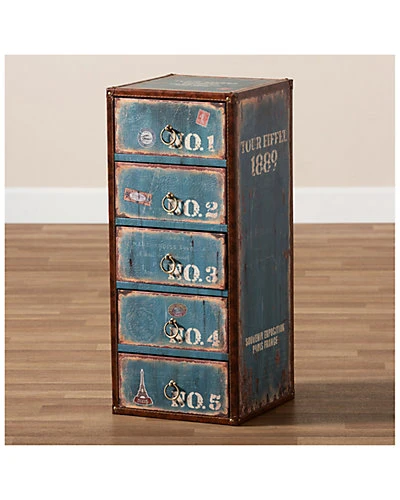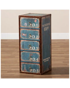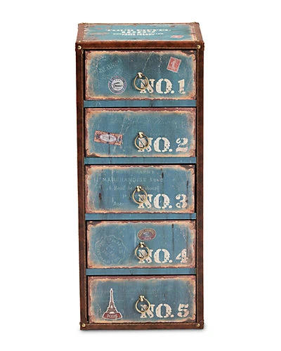 - Bring a piece of Paris into your home with the travel inspired Alba chest. Decorated in weathered colors, text, and stamps, this piece holds a look certain to remind anyone of their travels to, or love for, Paris, France. The Alba is made in China and contains five drawers, each fitted with brass metal ring pulls, to serve as the perfect place for souvenirs or other items. Distinctive faux leather bands, studded with gold-tone stitching and pins, line the angles of the Alba to add to its wonderful travel aesthetic. The Alba will arrive fully assembled and goes beyond the mundane by bringing a piece of Paris into your home. Dimensions: 28.3″ high x 11.8″ wide x 11.8″ deep; Drawer dimensions: 4.3″ high x 10.4″ wide x 11.8″ deep.