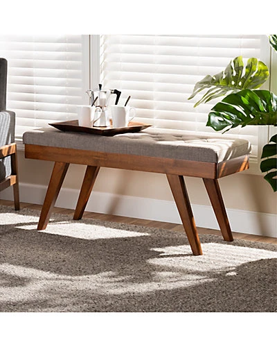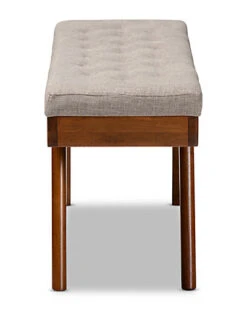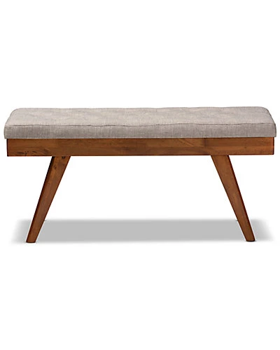 - Design details: Add some visual interest to your dining room setup with the Alona dining bench. This wood bench is upholstered in a soft, grey polyester fabric that is complimentary to the walnut brown finish on the wood. Influenced by elements of mid-century modern design, the Alona features angled, tapered legs. This versatile piece works well as seating at a dining table, or is equally suitable for use as an accent piece in the entryway. The Alona dining bench is made in Malaysia and requires assembly.