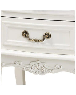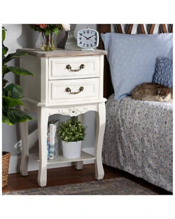 - Design details: Enhance your bedroom with the charming Amalie nightstand. Constructed from wood, this nightstand pairs a white-washed oak tabletop with polished white drawers. The tabletop features space to place a lamp, while two drawers offer storage space for bedside knick-knacks. Each drawer is adorned with molding detailing and an elegant brass metal handle. Additional storage space is provided by an open shelf on the bottom. Inspired by French provincial furniture, the Amalie displays exquisite cabriole legs. The Amalie nightstand is made in China and will arrive fully assembled.