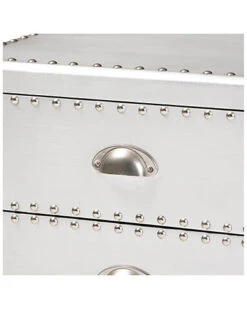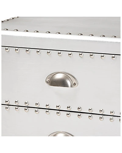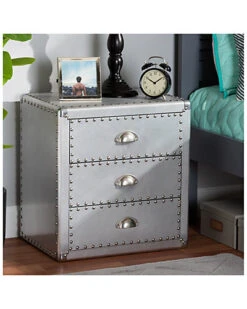 - Design details: Bring chic industrial style into your bedroom with the Armel nightstand. Constructed from metal, this silver nightstand features cool rivet detailing along its edges. Three drawers provide space to keep bedside essentials organized. Polished silver metal drawer handles add a sleek touch. Inspired by vintage storage trunks, the Armel is fitted with corner protectors. Use this piece as a nightstand in the bedroom or as an accent piece in the living room. The Armel nightstand is made in China and will arrive fully assembled.