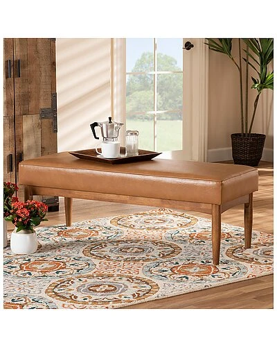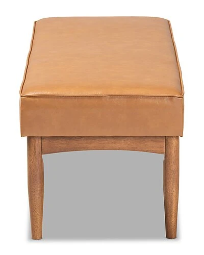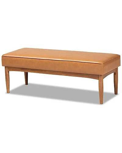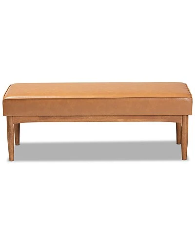- Enjoy weekend brunches and casual dinners with the Arvid dining bench. the Arvid is constructed from sturdy wood in a walnut brown finish. Tan faux leather upholstery lends a sleek look and makes it easy to coordinate with a wide range of color palettes. Inspired by stylish mid-century modern design, the bench showcases tapered legs. This Arvid dining bench requires assembly and can be combined with the other pieces in the collection to create a cozy dining nook. Dimensions: 16.5″ High x 46.5″ Wide x 18″ Deep; Seating Dimensions: 16.5″ High (from Floor) x 46.5″ Wide x 18″ Deep; Legs: 11.4″ High;