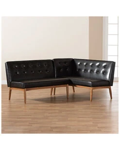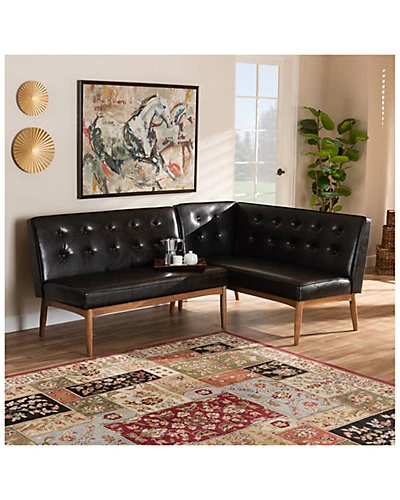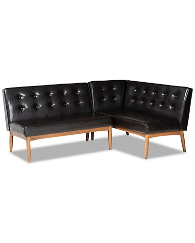 - Enjoy weekend brunches and casual dinners with the Arvid 2-piece dining sofa bench. Made in Malaysia, the Arvid is constructed from wood in a walnut brown finish and fitted with dark brown faux leather that is easy to coordinate with a wide range of color palettes. Inspired by stylish mid-century modern design, the sofa showcases button tufting and tapered legs. This cozy piece requires assembly and is designed to be placed in the corner of your kitchen or dining area, allowing you to maximize your space while still maintaining a chic set-up. Combine this sofa bench with the other pieces in the Arvid dining collection to complete the look. Dimensions: 31.5″ High x 53.5″ Wide x 26.4″ Deep; Seating Dimensions: 16.5″ High (from Floor) x 46.5″ Wide x 20″ Deep; Back: 15″ High; Legs: 10″ High.