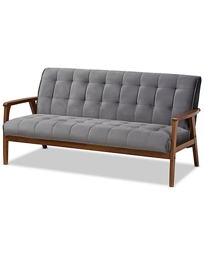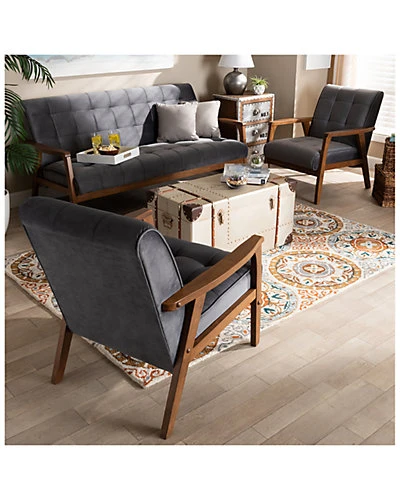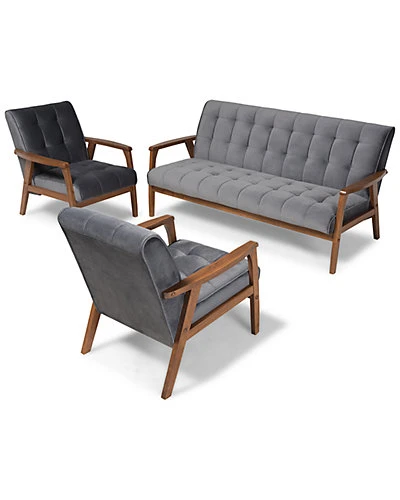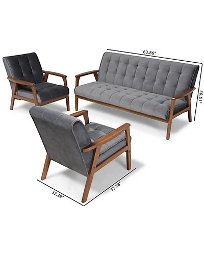 - Design details: Declare your allegiance to timelessness with the Asta living room set. Constructed from solid rubberwood, the Asta set includes one sofa and two chairs. Each piece is upholstered in a soft, sumptuous grey velvet fabric that complements the walnut brown finish on the wood. Wide, plush cushions provide ample seating comfort, while biscuit tufting and angled legs lend a cool, retro look. Stylish and versatile, this set is well suited for both private living spaces and public reception areas. The Asta living room set is made in Malaysia and requires assembly.* Sofa Measures 32.28in x 63.86in x 30.51in