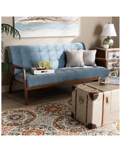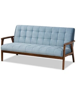 - Design details: Declare your allegiance to timelessness with the Asta sofa. Constructed from solid rubberwood, the Asta showcases clean lines and a low profile. Soft, sumptuous light blue velvet upholstery gives this sofa a distinctive look that pairs well with the walnut brown finish on the wood. Wide, plush cushions provide ample seating comfort, while biscuit tufting and angled legs lend a cool, retro feel. Stylish and versatile, this sofa is well suited for both private living spaces and public reception areas. The Asta sofa is made in Malaysia and requires assembly.