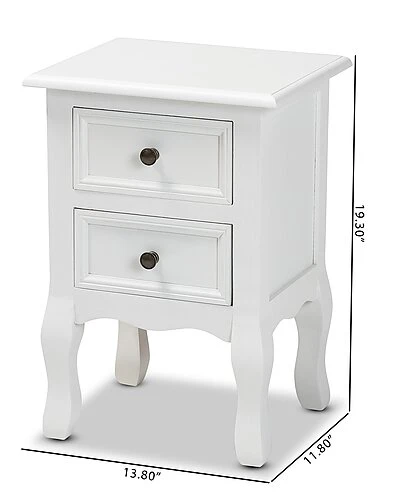 - Arrange a charming bedroom layout with the classic elegance of the Caelan nightstand. this nightstand is crafted from sturdy wood. Two drawers accented with inset paneling provide ample storage space to organize all your bedtime essentials. Comes fully assembled, the Caelan is supported by cabriole legs for excellent stability and support in expressive design. Round drawer knobs give the nightstand a varied visual texture, making the Caelan a remarkable addition to the modern bedroom. Overall Dimensions: 19.30in High x 13.80in Wide x 11.80in Deep; Drawer Dimensions: 8.70in Wide x 10.00inDeep x 4.30inHigh; Legs: 8.70in High;
