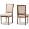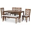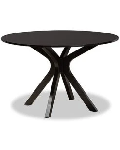 - Elegance and comfort come together in the Callie dining set. the Callie includes six chairs and one table constructed from sturdy wood finished in a rich dark brown. Each chair is fitted with a foam-padded cushion upholstered in a smooth sand tone fabric and features a unique cut-out design on its back. Requiring assembly, the circular tabletop provides ample elbow room for each member of the table. Ideal for both casual and formal occasions, the Callie dining set easily updates the modern home. Table Dimensions: 29.9″ high x 47.2″ wide x 47.2″ deep; Legs: 29.1″ high; Chiar Dimensions: 38.6″ High x 18.7″ Wide x 19.3″ Deep; Seating dimensions: 18.7″ wide x 15.7″ deep x 17.9″ high (from Floor); Back: 19.7″ high; Legs: 16.9″ high;