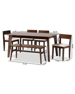 - Introduce the delightful simplicity of the mid-century to your space with the Camilla dining set. Made in Malaysia, this lovely set includes four chairs, one bench, and one dining table crafted from sturdy wood. The chairs feature a foam-padded cushion upholstered in smooth fabric as well as a curved backrest for superb dining comfort. The Camilla requires assembly and features a rectangular tabletop to ensure ample space for each member of the table. Understated yet evocative, the Camilla dining set forms a pleasant arrangement in any dining space. Overall Table: 59.10″ W x 35.40″ D x 29.90″ H; Table Legs: 29.10″; Overall Chair(s): 17.50″ W x 19.70″ D x 30.30″ H; Seating Area Dimensions: 18.10″ W x 16.30″ D x 18.90″ H; Back: 11.40″ H; Chair Legs: 14.50″ H;