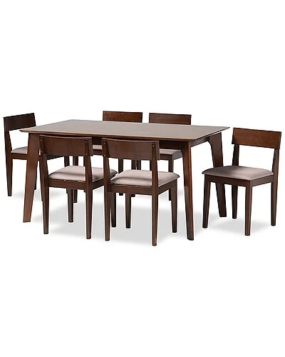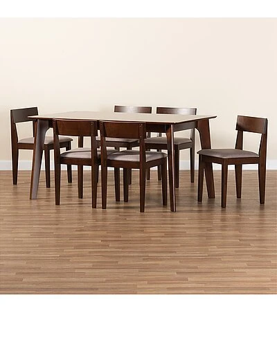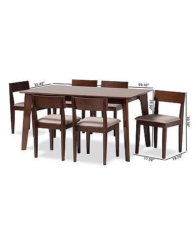- Introduce the delightful simplicity of the mid-century to your space with the Camilla dining set. Made in Malaysia, this lovely set includes six chairs and one dining table crafted from sturdy wood. The chairs feature a foam-padded cushion upholstered in smooth fabric as well as a curved backrest for superb dining comfort. The Camilla requires assembly and features a rectangular tabletop to ensure ample space for each member of the table. Understated yet evocative, the Camilla dining set forms a pleasant arrangement in any dining space. Overall Table: 59.10″ W x 35.40″ D x 29.90″ H; Table Legs: 29.10″; Overall Chair(s): 17.50″ W x 19.70″ D x 30.30″ H; Seating Area Dimensions: 18.10″ W x 16.30″ D x 18.90″ H; Back: 11.40″ H; Chair Legs: 14.50″ H;