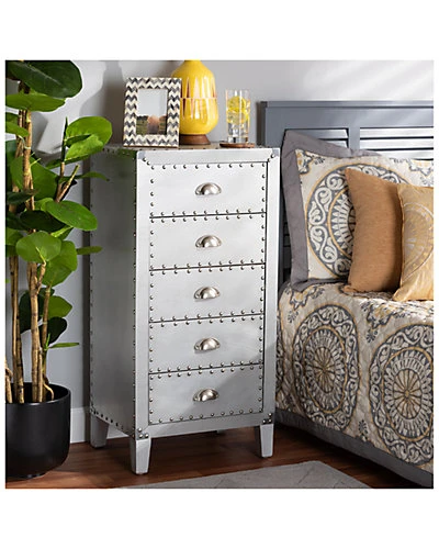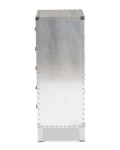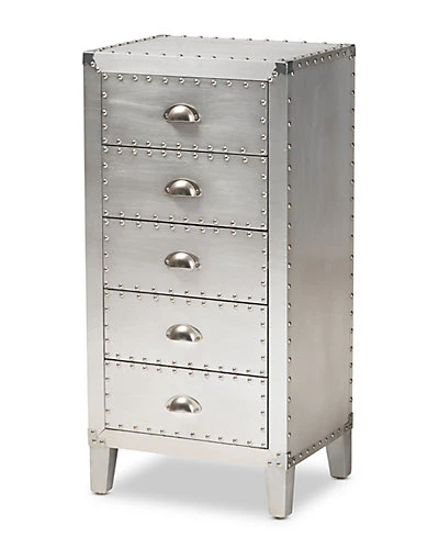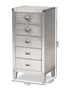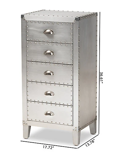- Design details: Add a cool industrial vibe to your space with the Carel chest. Built from sturdy metal, this silver chest provides five spacious drawers to keep items organized and out of sight. Inspired by vintage storage trunks, the Carel features corner protectors and elaborate rivet accents. Polished metal drawer handles complete the look. Use this stylish piece in the bedroom, living room, or hallway. The Carel chest is made in China and will arrive fully assembled.