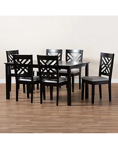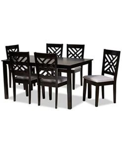 - Design details: Redefine your dining space with the elegance and comfort of the Caron 7-piece dining set. Constructed from solid rubberwood in an espresso finish, this dining set includes one table and four chairs, each upholstered in a light polyester fabric that complements the dark wood finish. Padded with foam for the highest level of dining comfort, each chair features a stunning cut-out back for enhanced visual appeal. Whether used for chic dinner parties or casual family dinners, the Caron set is sure to elevate any dining experience. The Caron 7-piece dining set is made in Malaysia and requires assembly. Chair