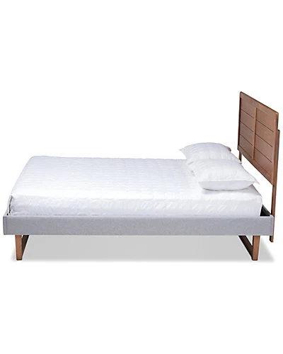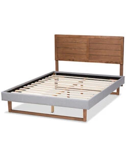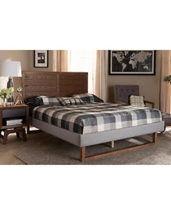 - Enhance your bedroom with the warm wood tones and soft grey fabric found in the rustic modern Claudia bed. The Claudia bed features a supportive , wood paneled headboard, perfect for leaning against to read or watch television. Made in Malaysia, the bed includes a soft, fabric upholstered platform base that eliminates the need for a box spring. The Claudia requires assembly and comes with six pre-drilled holes on the headboard to provide five unique height options for a customized setup. Bring a cozy yet stylish ambiance to any bedroom with the inviting Claudia bed. Dimensions: 58.3″ high x 79.5″ wide x 83.4″ deep; Headboard: 58.3″ wide x 78.1″ long x 0.9″ thick; Height from floor to top of slat: 11.8″ high; Legs: 9.1″ high; Inside dimensions (mattress size): 76″ wide x 80″ deep.