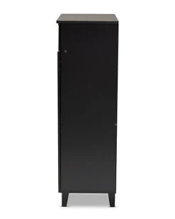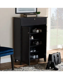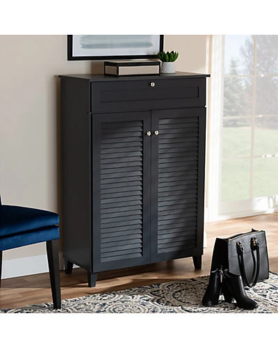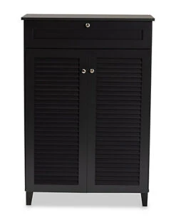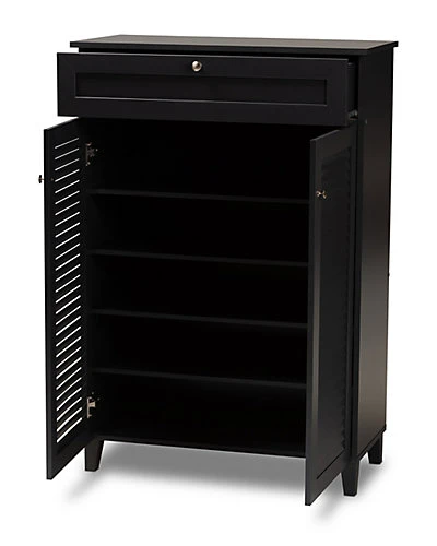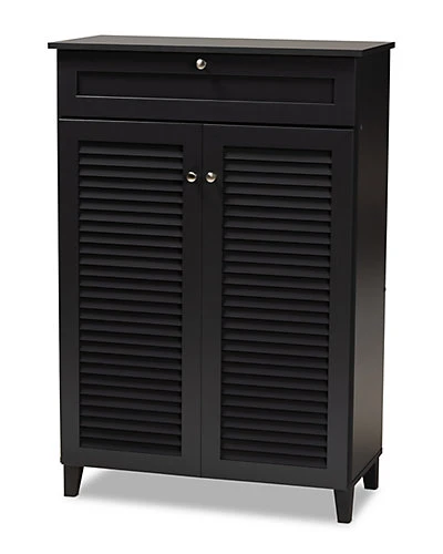 - Design details: Store your shoes on the sly with the Coolidge shoe cabinet. Two slatted doors, fitted with round knobs, conceal five shelves with storage space for up to 15 pairs of shoes. One spacious drawer, accented with inset paneling, provides additional storage space for extra shoelaces and miscellaneous items. Tapered legs add refined style and provide elevation to deter dust buildup. Constructed from engineered wood, the Coolidge showcases a sleek dark grey finish that complements any color scheme. The Coolidge shoe cabinet is made in Malaysia and requires assembly.