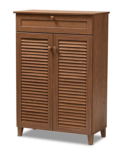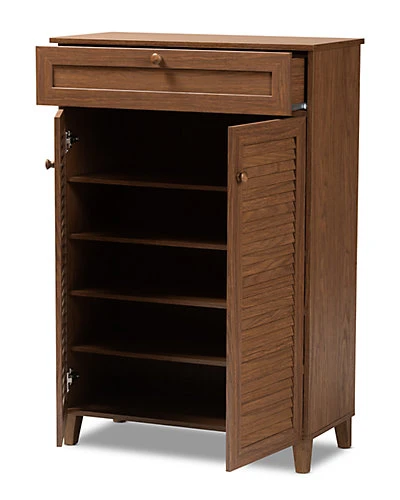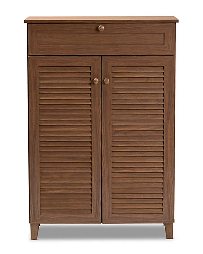 - Design details: Store your shoes on the sly with the Coolidge shoe cabinet. Two slatted doors, fitted with round knobs, conceal five shelves with storage space for up to 15 pairs of shoes. One spacious drawer, accented with inset paneling, provides additional storage space for extra shoelaces and miscellaneous items. Tapered legs add refined style and provide elevation to deter dust buildup. Constructed from engineered wood, the Coolidge showcases a classic walnut brown finish that complements any color scheme. The Coolidge shoe cabinet is made in Malaysia and requires assembly.