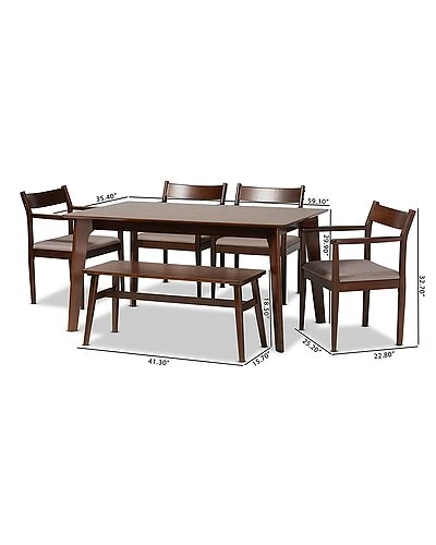 - Reintroduce the allure of classic design into your space with the lovely Coretta dining set. Made in Malaysia, this set includes four chairs, one bench, and one dining table crafted from sturdy wood. The chairs feature a foam-padded cushion upholstered in smooth fabric as well as ergonomic armrests for superb comfort during meals. The Coretta dining set requires assembly and features a rectangular tabletop to ensure ample space for each member of the table. Blending timeless elegance with modern standards, the Coretta dining set redefines any dining space. Overall Table: 59.10″ W x 35.40″ D x 29.90″ H; Table Legs: 29.10″; Overall Chair(s): 25.20″ W x 22.80″ D x 32.70″ H; Seating Area Dimensions: 22.80″ W x 18.40″ D x 18.10″ H; Back: 14.60″ H; Chair Legs: 14.00″ H; Arms: 26.25″ H;