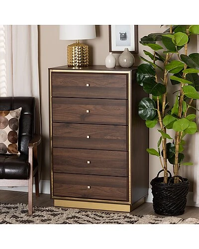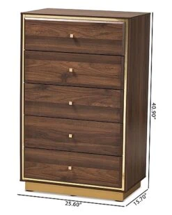 - Injected with modern glamour, the Cormac storage chest is sure to become a beloved addition to any bedroom layout. this handy piece is comprised of a sturdy wood frame adorned with metal accents. Five drawers offer ample storage space to organize and declutter busy rooms in eye-catching style. The Cormac requires assembly and features tapered drawer knobs, which accentuate the luxurious embellishments of the piece. Updated for the modern era, the Cormac storage chest grants a pleasant aura to any space. Overall Dimensions: 40.90″ High x 25.60″ Wide x 15.70″ Deep; Drawer Dimensions: 21.40″ Wide x 12.60″ Deep x 3.90″ High; Base/Legs: 2.20″ High;