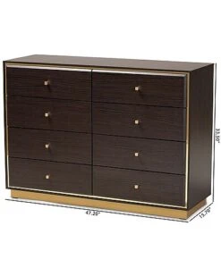 - Redefine your bedroom to fit your needs with the outstanding capabilities of the Cormac dresser. Made in Malaysia, this stunning piece is comprised of a broad wood frame adorned with metal accents. Boasting exceptional storage capacity, the Cormac dresser features eight wide drawers to organize clothes, linens, and more. The Cormac requires assembly and features small, square knobs for a modern minimalist touch. A visually stunning yet efficient piece, the Cormac dresser is a fantastic addition to the modern bedroom.