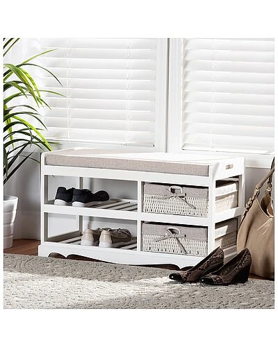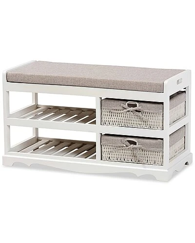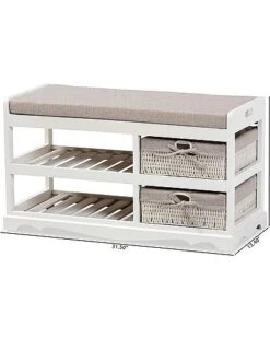 - Generate an elegant, contemporary feel in your space with the remarkable Dalair storage bench. Made in China, this bench is comprised of a sturdy wood frame fitted with two baskets. Its plush cushion is padded with soft foam and upholstered in smooth fabric for excellent comfort. Comes fully assembled, the Dalair features two open shelves and two baskets to organize shoes and other outdoor essentials. Fabric basket liners add a touch of grace, making the Dalair storage bench an outstanding addition to the modern entryway. Overall Dimensions: 17.70″ High x 31.50″ Wide x 13.40″ Deep; Seating Area Dimensions: 31.50″3.40 Wide x 1″Deep x 17.70″High; Basket Dimensions: 12.60″ Wide x 13.39″Deep x 4.72″High; Shelf Dimensions: 12.60″ Wide x 17.50″Deep x 4.72″High;Legs: 1.58″ High;