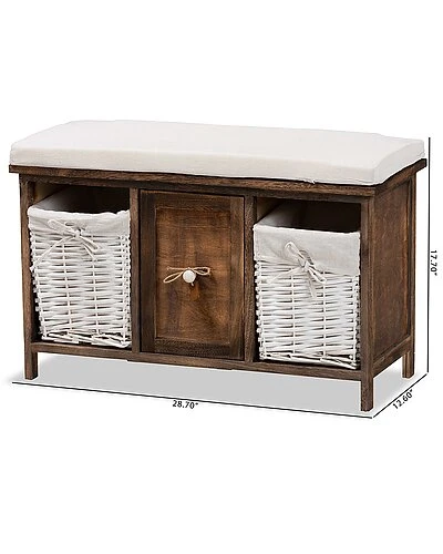 - Unique and versatile, the Dalius storage bench furnishes your entryway with modern convenience. Made in China, this bench is comprised of a sturdy wood frame fitted with willow baskets. Two baskets and one drawer provide ample space to organize shoes and other outdoor essentials. Comes fully assembled, the Dalius features a plush cushion padded with layers of foam and upholstered in fabric for smooth comfort. Inset paneling lends visual texture and depth, making the Dalius storage bench a striking addition to the modern entryway. Overall Dimensions: 17.70″ High x 28.70″ Wide x 12.60″ Deep; Seating Area Dimensions: 28.80″ Wide x 12.50″Deep x17.70″ High; Drawer Dimensions: 9.50″ Wide x 7.50″ Deep x 11.50″ High; Legs: 2.25″ High;