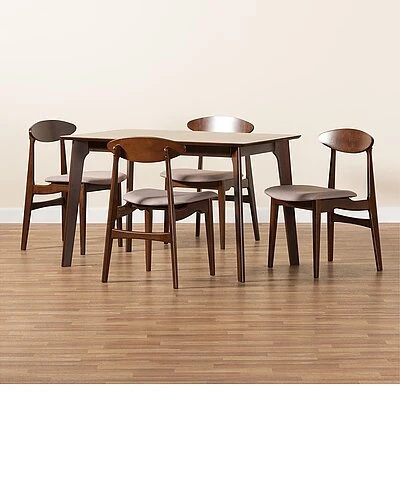 - Embellish your space with the refined charisma of the Daria dining set. Made in Malaysia, this exquisite set includes four chairs and one dining table. Each seat features a cozy foam-padded cushion upholstered in soft fabric while the bent seat and backrest provide excellent support. The Daria requires assembly and features a broad, rectangular tabletop to ensure ample space for each member of the table. Coordinating modern comfort with mid-century flair, the Daria dining set elevates any interior. Overall Table: 47.20″ W x 29.50″ D x 29.90″ H; Table Legs: 29.10″ H; Overall Chair(s): 19.10″ W x 22.40″ D x 31.50″ H; Seating Area Dimensions: 19.10″ W x 17.10″ D x 18.50″ H; Back: 13.00″ H; Chair Legs: 16.50″ H;