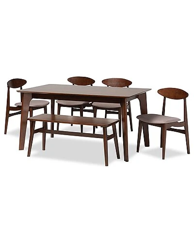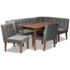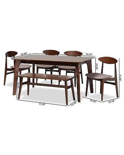 - Embellish your space with the refined charisma of the Daria dining set. Made in Malaysia, this exquisite set includes four chairs, one bench, and one dining table. The chairs feature a cozy foam-padded cushion upholstered in soft fabric while the bent seat and backrest provide excellent support. The Daria requires assembly and features a broad, rectangular tabletop to ensure ample space for each member of the table. Coordinating modern comfort with mid-century flair, the Daria dining set elevates any interior. Overall Table: 59.10″ W x 35.40″ D x 29.90″ H; Table Legs: 29.10″; Overall Bench: 41.30″ W x 15.70″ D x 18.50″ H; Seating Area Dimensions: 41.30″ W x 15.70″ D x 18.50″ H; Bench Legs: 17.00″ H;