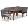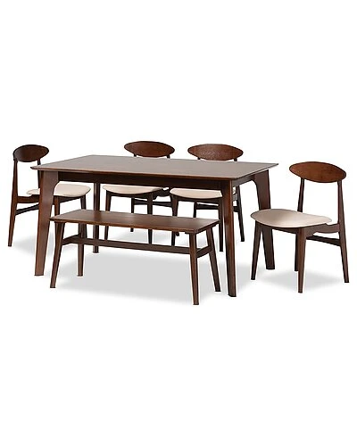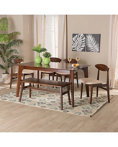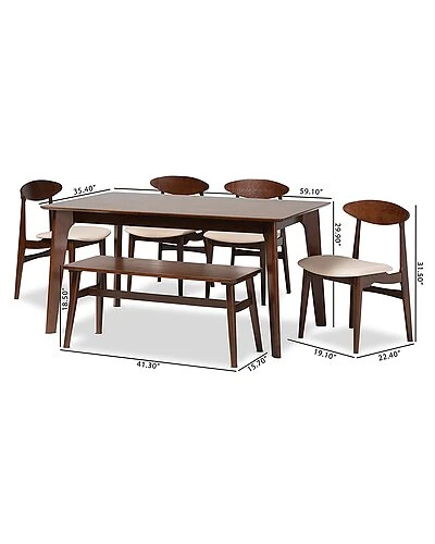 - Embellish your space with the refined charisma of the Daria dining set. Made in Malaysia, this exquisite set includes four chairs, one bench, and one dining table. The chairs feature a cozy foam-padded cushion upholstered in soft fabric while the bent seat and backrest provide excellent support. The Daria requires assembly and features a broad, rectangular tabletop to ensure ample space for each member of the table. Coordinating modern comfort with mid-century flair, the Daria dining set elevates any interior. Overall Table: 59.10″ W x 35.40″ D x 29.90″ H; Table Legs: 29.10″; Overall Chair(s): 19.10″ W x 22.40″ D x 31.50″ H; Seating Area Dimensions: 19.10″ W x 17.10″ D x 18.50″ H; Back: 13.00″ H; Chair Legs: 16.50″ H;