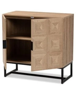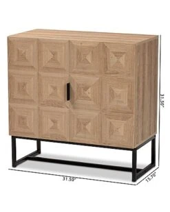- A sleek presentation of modern geometry, the Darien storage cabinet is a refined solution to your household needs. this handy piece is comprised of wood frame on top a solid metal base. The doors open to reveal two spacious shelves with plenty of room to organize and declutter busy areas of your home. The Darien requires assembly and showcases a sleek, geometric grain pattern for an added touch of modern charisma. Slim, minimalist door handles complete the look, making the Darien storage cabinet a remarkable addition to any space. Overall Dimensions: 31.50″ High x 31.50″ Wide x 15.70″ Deep; Storage Behind Door(Each): 30.20″ Wide x 15.00″ Deep x 9.20″ High; Table Top: 31.50″ Wide x 15.70″ Deep x 0.60″ Thick; Legs: 7.90″ High;