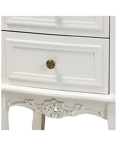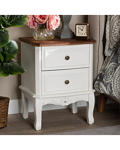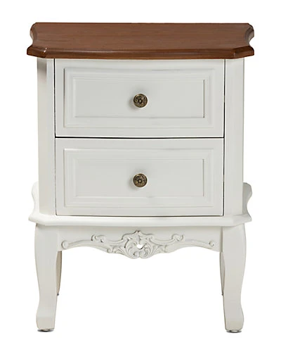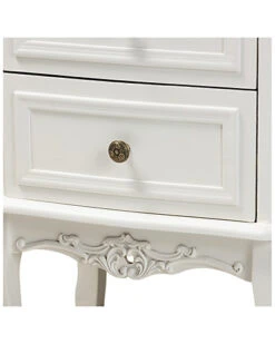 - Design details: Bring a simple elegance to your bedroom with the wonderfully crafted Darlene nightstand. Fitted with two drawers, this piece offers plenty of room for night time necessities. The Darlene is made in China and showcases unique woodwork with inset paneled drawers and cabriole legs, giving the piece a traditional look. Fully assembled, the Darlene’s cherry brown finished wood top offers ample space to display decorations. Artistically engraved knobs add a touch of glamour that elevate the Darlene into a fantastic choice for any bedroom. Dimensions: 23.4″ high x 19.3″ wide x 13.6″ deep; Drawer dimensions: 5.9″ high x 13.4″ wide x 11.4″ deep; Legs: 9.1″ high.