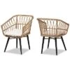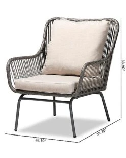 - Bask in the refreshing air of the outdoors with the plush comfort of the Dermot patio chair. This chair is comprised of a steel frame wrapped in durable synthetic rattan. Its plush seat and cushion are padded with layers of soft foam and upholstered in smooth yet weather-resistant fabric. The Dermot requires assembly and features smooth armrests for ergonomic comfort as you relax outside. Take advantage of pleasant summer days and cool nights with the outstanding Dermot patio chair. Chair Dimensions: 33.9in High x 28.1in Wide x 30.3in Deep; Seating Area Dimensions 20.75in Wide x22.5in Deep x17in High; Arm Height: 22.5in; Legs: 12.75in High; Back: 16.9in High