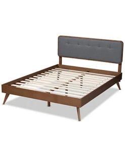 - Design details: Cool retro style meets modern craftsmanship in the Dilara bed. Built with a low platform set on top of angled, tapered legs, the Dilara displays all the hallmarks of stylish mid-century modern design. The headboard is upholstered in a soft, resilient polyester fabric and features rounded edges for contemporary look. A single row of button tufting adds a touch of refinement. Constructed from sturdy wood, the Dilara flaunts a rich walnut brown finish that complements any color palette. The Dilara bed is made in Malaysia and requires assembly.