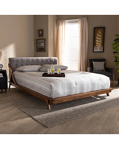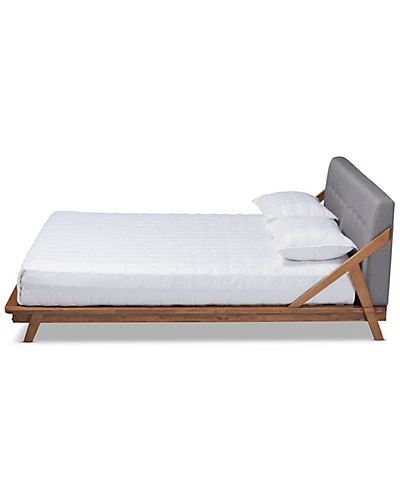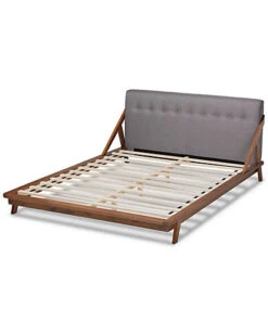 - Design details: A clever use of lines and angles makes the Sante bed a stylish addition to any bedroom. Influenced by elements of mid-century modern design, the Sante is built with a low platform elevated by angled legs. The rich walnut brown-finished wood frame is complemented by an elegant fabric upholstered headboard. A single row of button tufting on the headboard adds a refined touch. The Sante bed is made in Malaysia and requires assembly.
