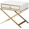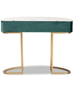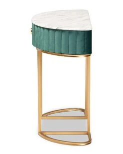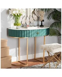 - Add unique, glamorous charm to your space with the Beale console table. the Beale is comprised of a gold finished metal frame topped with a spacious faux marble tabletop for a luxurious aesthetic that also serves to declutter busy areas. One drawer provides storage space, while its slim frame makes it well suited for tighter spaces. A gold-tone ring pull adds an extra touch of glamour. Requiring assembly, the Beale is upholstered in green velvet fabric enhanced with alluring channel tufting. Instantly upgrade your entryway or hallway with the dazzling Beale console table. Dimensions: 29.9″ High x 39.4″ Wide x 15.7″ Deep; Drawer: 3.5″ H x 14.75″ W x 13″ D