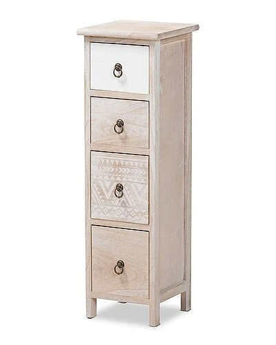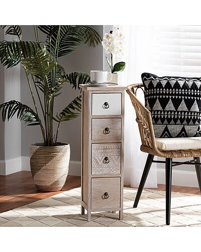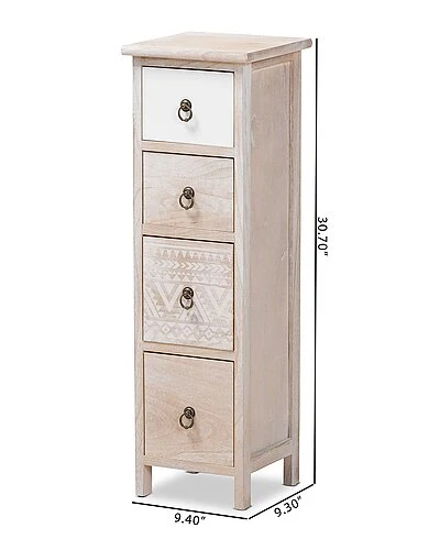 - The remarkable Seanna storage unit radiates tranquil vibes in your space with its stunning, dynamic design. This handy piece is crafted from sturdy wood and adorned with intricately molded metal ring-pulls. Four multi-sized drawers accommodate your storage needs by organizing your household essentials both large and small. The Seanna will arrive fully assembly and features a striking combination of natural wood grain and geometric shading for an eye-catching accent piece. With a slim frame, the Seanna storage unit is a perfect solution to enhance vacant areas of any interior. Overall Dimensions: 30.7in High x 9.4in Wide x 9.3in Deep; Drawer Dimensions: 6.9in Wide x7.7in Deep x 4.9in High; Legs: 2.2in High