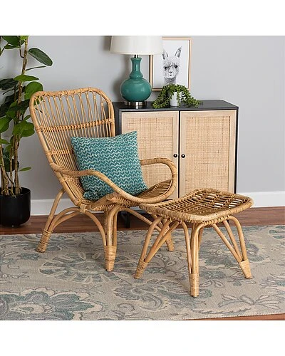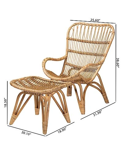 - Find yourself swept away in the exotic comfort of the lovely Earvin chair and footstool set. This bohemian inspired set includes one armchair and one footstool entirely comprised of natural rattan. The rounded backrest of the chair flows naturally into convenient armrests for a pleasantly inviting silhouette. Each piece of the Earvin requires assembly and features angled legs for excellent stability and support in eye-catching design. Expertly handcrafted, the Earvin chair and footstool set is sure to become a beloved oasis in any layout.