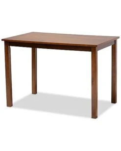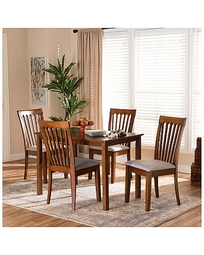- Timeless design is merged with modern comfort in the Seda dining set. this wooden set includes one table and four chairs, each upholstered in a light fabric that complements the walnut brown wood finish. An optimal balance of comfort and style, each chair features a plush foam-padded seat, as well as a striking cut-out design on its back for enhanced visual appeal. Requiring assembly, the rectangular tabletop provides ample elbow room for each member of the table. Whether used for formal dinner parties or casual family dinners, the Seda dining set is sure to elevate any dining experience. Table Dimensions: 29.13″ high x 43.31″ wide x 27.56″ deep; Chair Dimensions: 38.19″ high x 17.32″ wide x 21.65″ deep; Seating dimensions: 18.5″ wide x 16.14″ deep x 18.5″ high (from Floor); Legs: 16.93″ high;