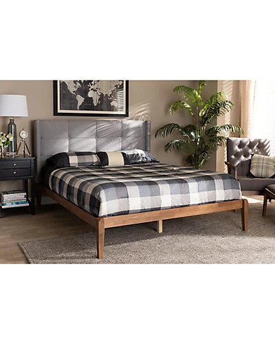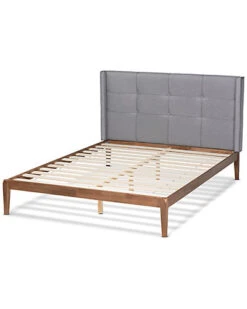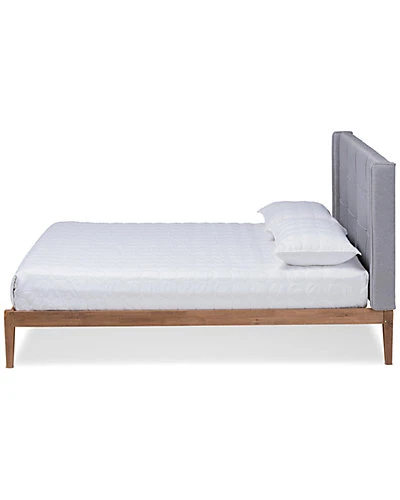 - Enjoy relaxed mornings and nights in the modern Edmond bed. Its large, foam padded headboard is upholstered in grey fabric and enhanced with elegant button tufting. Made in Malaysia, the bed is supported by sturdy wood legs, allowing for ample storage space underneath the platform. Assembly is required and a box spring isn’t necessary, as the Edmond comes with internal slats for mattress support. Ash walnut finished wood complements the clean, streamlined design of the frame, giving the whole bedroom a pleasant and contemporary feel. Dimensions: 44.49″ high x 58.62″ wide x 80.31″ deep; Headboard: 31.5″ wide x 58.62″ long x 4.72″ thick; Height from floor to top of slat: 12.4″ high; Legs: 12.99″ high; Inside dimensions (mattress size): 54″ wide x 74″ deep.