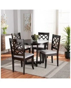 - Reinvent your dining room with the contemporary style of the Selby dining set. the set includes four dining chairs and one table constructed from sturdy wood in a rich dark brown finish. Each chair is equipped with a foam padded seat upholstered in smooth grey fabric. Requiring assembly, the large, circular tabletop ensures plenty of elbow room for each member of the table. Saber legs add an elegant feel, making the Selby dining set a fantastic upgrade to any home. Table Dimensions: 29.9″ high x 35.4″ wide x 35.4″ deep; Legs: 29.1″ high;Chair Dimensions: 37.4″ High x 18.1″ Wide x 20.3″ Deep; Seating Dimensions: 17.9″ High (from Floor) x 18.7″ Wide x 15.7″ Deep; Back: 19.5″ High; Legs: 16.9″ High
