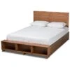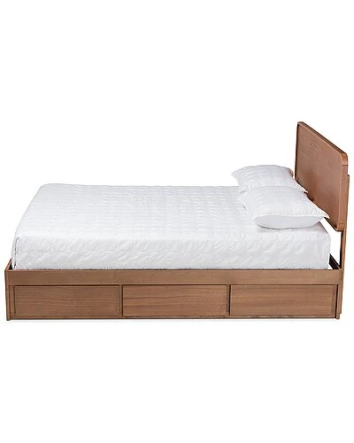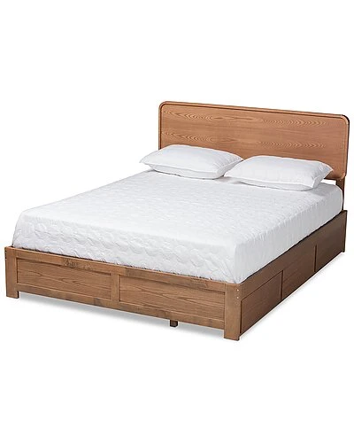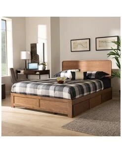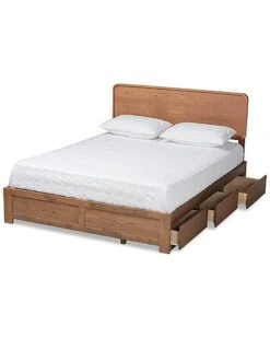 - Utilize your bedroom space to the fullest with the Elen1 bed. the Elen1 is constructed from sturdy wood finished in a neutral ash walnut to easily blend in with a large variety of room layouts and styles. Three underside drawers located on one side of the frame supply superb storage potential while maximizing floor space. Assembly is required and a box spring is not needed, as the bed comes with internal slats for mattress support. The headboard features curved edges that create a cool, mid-century inspired backdrop, making the Elen1 bed a cozy and efficient addition to any bedroom. Over all Dimensions: 58.3″ High x 57.2″ Wide x 79.3″ Deep; Headboard Dimensions: 19.7″ High x 57.2″ Wide x 1.6″ Thick; Dimensions: 13″ High x 57.2″ Wide x 77.7″ Deep; Slats: 55.5″ Wide x 2.5″ Long x 0.6″ Thick; Top of Slat: 11.8″ High; Legs: 9.1″ High; Inside Dimensions (Mattress Size): 54″ Wide x 74″ Deep; Storage dimensions: 23.7″ Wide X 14.1″ Deep X 7.9″ High