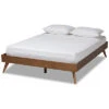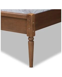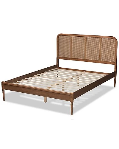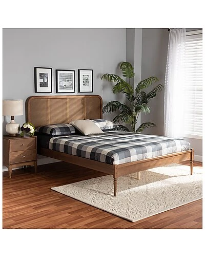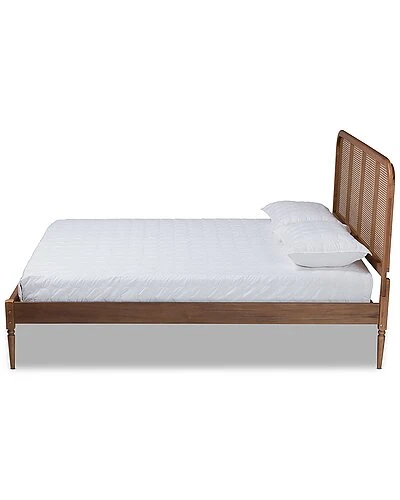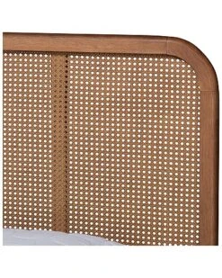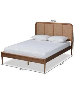 - The Elston bed invigorates your bedroom with a sophisticated twist on classic design. Made in Malaysia, this bed is constructed from sturdy wood showcasing a natural ash walnut finish. The headboard is woven with synthetic rattan and conveys a refreshing, mid-century feel. The Elston requires assembly and utilizes wood slats for mattress support, which eliminate the need for a box spring. Turned legs add a classic touch, making the Elston bed a remarkable addition to any bedroom space. Overall Dimensions: 47.24in High x 80.43in Wide x 84.64in Deep; Inside Dimensions (mattress size): 78.00in Wide x 81.10in Deep; Headboard Dimensions: 80.43in Wide x 20.50in High x 1.80in Thick; Distance from top of slat to bottom of headboard: 14.40in; Distance between each slat: 3.50in; Height from Floor to Top of Slat: 12.40in High; Legs: 10.10in High;