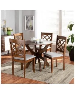 - Superb comfort and contemporary design create the extraordinary Beth dining set. the set includes four dining chairs and one table constructed from sturdy wood in a warm walnut brown finish. Each chair is fitted with a foam-padded seat and upholstered in smooth grey fabric. Requiring assembly, the large, circular tabletop ensures plenty of elbow room for each member of the table. Well suited for both casual and formal dining, the Beth dining set is an exceptional addition to any home. Table Dimensions: 29.9″ high x 35.4″ wide x 35.4″ deep; Legs: 29.1″ high;Chair Dimensions: 37.4″ High x 18.1″ Wide x 20.3″ Deep; Seating Dimensions: 17.9″ High (from Floor) x 18.7″ Wide x 15.7″ Deep; Back: 19.5″ High; Legs: 16.9″ High