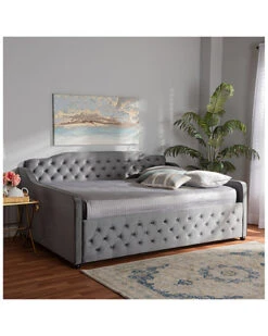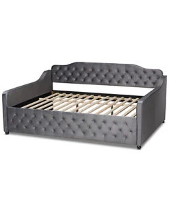 - Lounge and sleep in style with the Freda daybed. Its sturdy wooden frame is padded in foam and upholstered in a soft, sumptuous velvet fabric that provides ample comfort for resting. Sloping arms and the cut-out back panel convey a regal look. Button tufting and piping accentuate the stunning tones in the velvet, while black ball feet lend a sleek touch. The Freda daybed is made in Malaysia and requires assembly. Dimensions: 39.37″ High x 88.39″ Wide x 63.78″ Deep; Arms: 31.1″ High; Trundle Maximum Mattress Height: 7.87″ High; Inside Dimensions (Mattress Size): 60″ Wide x 80″ Deep.