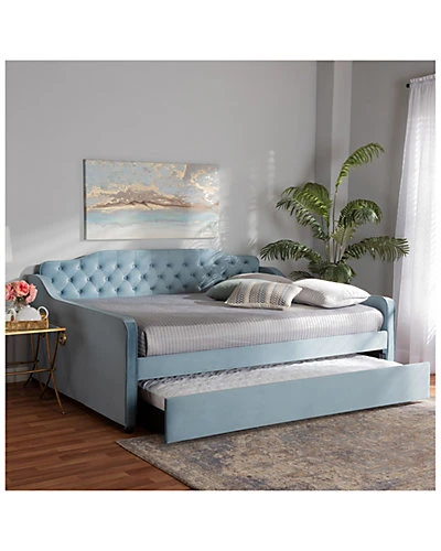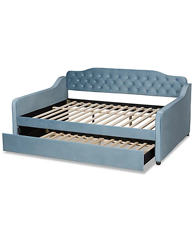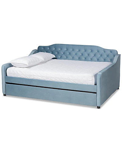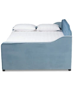 - Lounge and sleep in style with the Freda daybed. This versatile piece is fitted with a pull-out trundle to provide convenient accommodation for overnight guests. Its sturdy wooden frame is padded in foam and upholstered in a soft, sumptuous velvet fabric that provides ample comfort for resting. Button tufting and piping accentuate the stunning tones in the velvet, while black ball feet lend a sleek touch. The Freda daybed is made in Malaysia and requires assembly. Dimensions: 39.37″ High x 88.39″ Wide x 63.78″ Deep; Arms: 31.1″ High; Trundle: 76.77″ Wide x 40.94″ Deep x 11.42″ High; Trundle Maximum Mattress Height: 7.87″ High; Inside Dimensions (Mattress Size): 60″ Wide x 80″ Deep.
