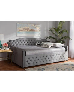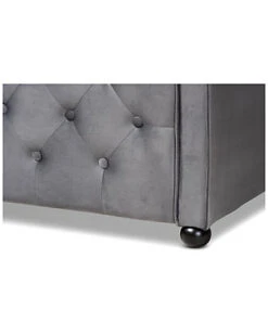 - Lounge and sleep in style with the Freda daybed. Its sturdy wooden frame is padded in foam and upholstered in a soft, sumptuous velvet fabric that provides ample comfort for resting. Sloping arms and the cut-out back panel convey a regal look. Button tufting and piping accentuate the stunning tones in the velvet, while black ball feet lend a sleek touch. The Freda daybed is made in Malaysia and requires assembly. Dimensions: 39.37″ High x 83.27″ Wide x 57.48″ Deep; Arms: 31.1″ High; Trundle Maximum Mattress Height: 7.87″ High; Inside Dimensions (Mattress Size): 54″ Wide x 74″ Deep.