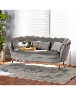 - Lounge in glamorous style with the expressive design of the Genia sofa. Made in China, this sofa is comprised of a sturdy wood frame padded with layers of foam and upholstered in luscious velvet fabric. The scalloped backrest is accented with channel tufting to form a unique, seashell-inspired outline that is sure to leave an impression. Requiring assembly, the Genia is supported by angled metal legs for stable support that lends a charming, retro feel. A visually striking and cozy addition, the Genia sofa enriches any interior. Overall Dimensions: 32.70″ High x 70.90″ Wide x 31.50″ Deep; Seating Area Dimensions: 55.90″ Wide x 23.20″ Deep x 18.50″ Height; Arm(from floor): 28.10″ High; Legs:9.30″ High; Back : 17.30″ High;