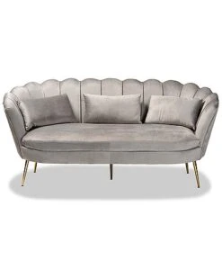 - Lounge in glamorous style with the expressive design of the Genia sofa. Made in China, this sofa is comprised of a sturdy wood frame padded with layers of foam and upholstered in luscious velvet fabric. The scalloped backrest is accented with channel tufting to form a unique, seashell-inspired outline that is sure to leave an impression. Requiring assembly, the Genia is supported by angled metal legs for stable support that lends a charming, retro feel. A visually striking and cozy addition, the Genia sofa enriches any interior. Overall Dimensions: 32.70″ High x 70.90″ Wide x 31.50″ Deep; Seating Area Dimensions: 55.90″ Wide x 23.20″ Deep x 18.50″ Height; Arm(from floor): 28.10″ High; Legs:9.30″ High; Back : 17.30″ High;