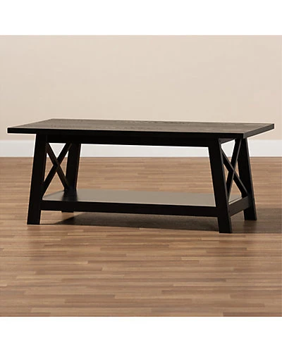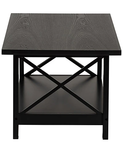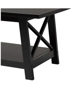 - Design details: Renovate your living room with the stylish and convenient Germain coffee table. Made in China, the Germain offers a large amount of surface area, as well as a lower shelf to store books, movies, or decorations. Criss-cross beams on either side of the table allow light to flow through and give the living room a pleasant, open feel. Featuring a black finish that complements its simple aesthetic, this wood table requires assembly. Angled legs give the Germain a sleek look while maximizing its utility. Dimensions: 17.7″ high x 39.4″ wide x 21.7″ deep; Open shelf: 12.5″ high x 33.3″ wide x 17.7″ deep; Legs: 2.5″ high.