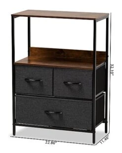 - Blending modern and industrial design elements, the Hakan cabinet is an exceptional solution to your storage needs. Made in China, this cabinet is comprised of a solid metal frame fitted with wood shelves and fabric upholstered drawers. The open shelves and wide tabletop offer space to organize and display decorations, while three drawers provide secure storage space. Requiring assembly, the Hakan features curved drawer handles that complement the minimalist metal frame. A fantastic accessory and tool, the Hakan storage cabinet adds the finishing touch to any space. Overall Dimensions: 32.10″ High x 22.80″ Wide x 11.40″ Deep; Drawer Dimension: 21.30″ Wide x 11.00″ Deep x 7.50″ High; Open Storage Dimension: 21.20″ Wide x 10.90″ Deep x 7.40″ High;