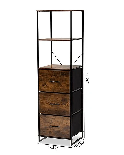 - Blending modern and industrial design elements, the Hakan cabinet is an exceptional solution to your storage needs. Made in China, this cabinet is comprised of a solid metal frame fitted with wood shelves and fabric upholstered drawers. Three open shelves create an eye-catching pedestal to organize and display decorations, while three drawers provide secure storage space. Requiring assembly, the Hakan features curved drawer handles that complement the minimalist metal frame. A fantastic accessory and tool, the Hakan storage cabinet adds the finishing touch to any space. Overall Dimensions: 61.20″ High x 17.30″ Wide x 15.70″ Deep; Drawer Dimension: 15.40″ Wide x 15.00″ Deep x 9.90″ High; Open Storage Dimension: 15.30″ Wide x 14.90″ Deep x 9.80″ High;