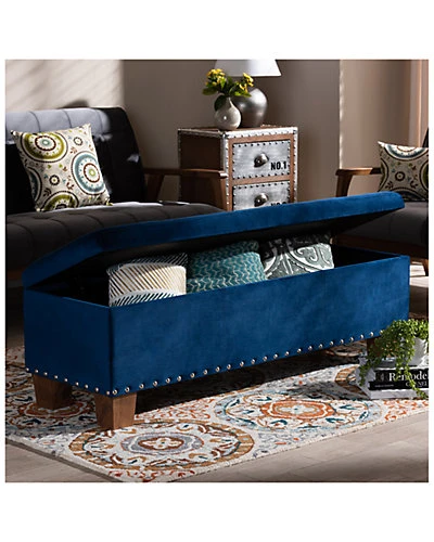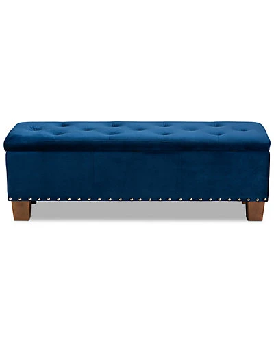 - Design details: For hidden storage that doubles as seating, opt for the Hannah storage bench. Constructed from rubberwood, the bench is upholstered in a soft velvet fabric that adds a dose of glamour to your space. The elegant button tufted top is foam padded for seating comfort and opens to reveal ample storage space for extra blankets and linens. Silver nail heads and walnut finished block feet lend a chic, modern look. The Hannah is well suited for use as a bed end bench in your bedroom or as an accent piece in your living room. The Hannah storage bench is made in Malaysia and requires leg assembly.